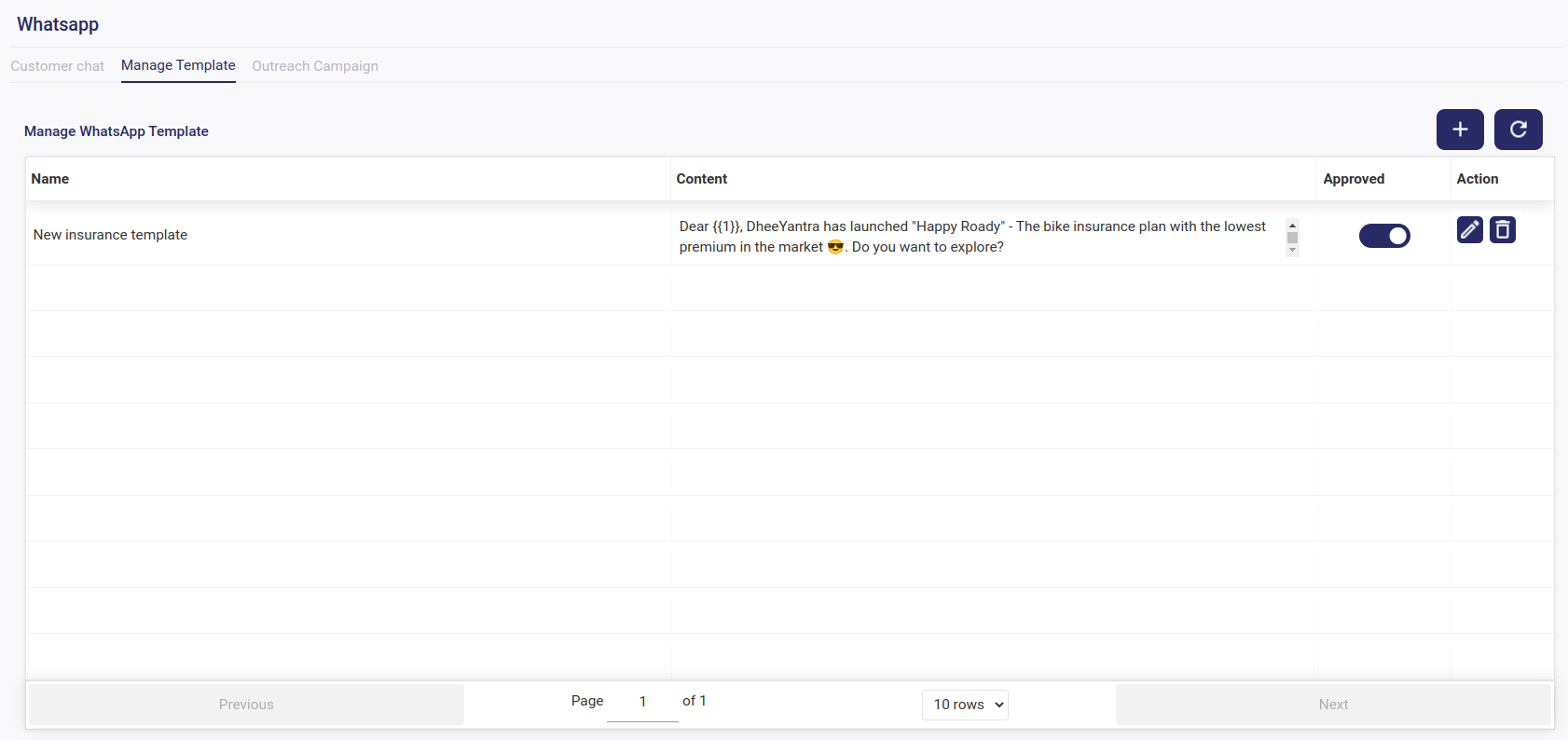Here, we can add or manage WhatsApp templates. For that, we need to add the name, and the message content along with the toggle button for the "Approved" option.